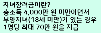 그러면 총소득이 4천만원 미만이면서 부양자녀가 있는 경우 한 명당 70만 원씩 지급한다 그러니 두 명만 있어도 한 달에 140만 원을 지급 받는 경우네요.