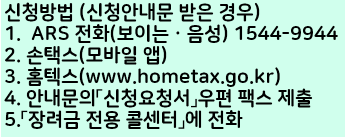 신청 방법은 ARS 전화를 통해서 신청하실 수도 있고 국세청 홈택스 모바일 어플 앱 홈택스를 이용해서 신청하실 수 있고 홈택스 홈페이지에 접속하셔서 신청하실 수 있습니다.