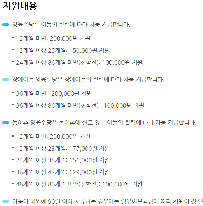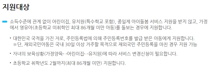 중요한것중에하나는 아동이 해외에 90일이상 체류할 경우 영유아보육법에 의거 지원이 정지될수있습니다.
