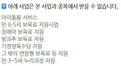 양육수당은 장애아, 방과후 보육료 지원과 그 밖의 연장형 보육료 등 지원 사업과는 중복해서 신청해서 지원받으실 수 없습니다. 천천히 설명드리겠습니다.