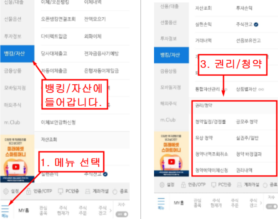 두번쨰. 뱅킹/자산에 들어가시면 권리청약 하위메뉴가 보입니다.