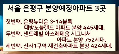 서울시 은평구에서 핫한 아파트 분양단지죠. 은평뉴타운 3-14블록 대방노블랜드 아파트 분양에 대해서 정리하였습니다. 아래 서울 은평구내 다른 아파트 분양계획도 확인하세요. 은평뉴타운에