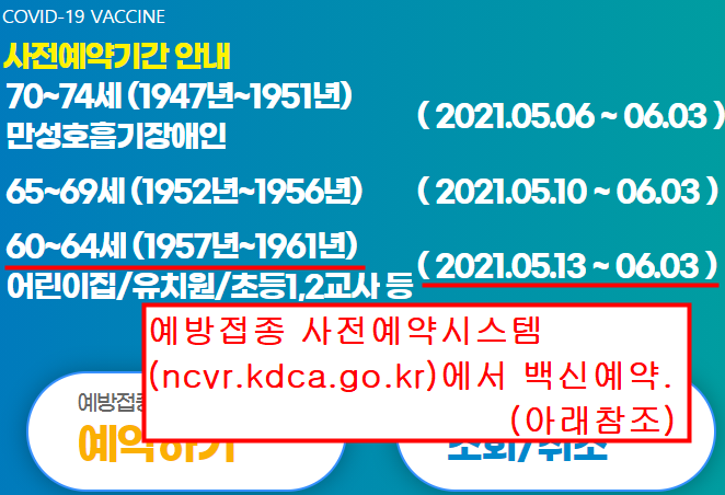 3. 60~64세(1957~1961년생) 백신 예약은 2021.5.13.~6.3.까지입니다.