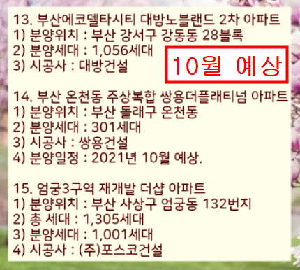 7곳 정도가 부산에서 분양예정인 1,000세대가 넘는 아파트들이 있습니다.