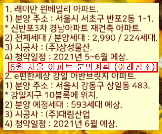 서울 아파트 청약은 말할것도 없이 경쟁률이 엉청납니다. 미리미리 분양예정인 아파트 청약일정을 확인하시게 도움이 됩니다. 그래서 서울 6월 분양예정 아파트 목록과 예상 청약일정표를 정리