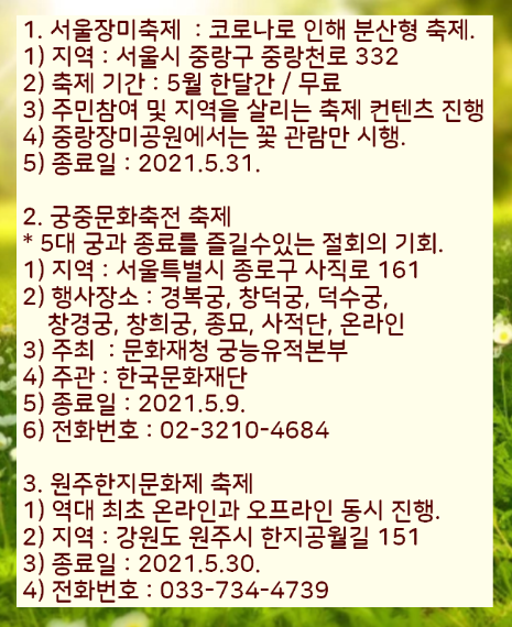 위에 5월 축제 일정들은 코로나 상황에 따라서 변동될수도 있습니다.
