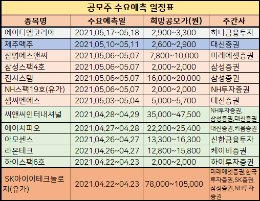 이렇게 2021년 5월 신규상장 주식들을 청약일정대로 표로 정리하였습니다.