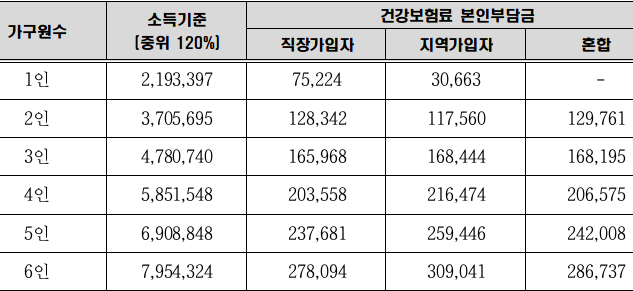 아래 중위 소득기준 120% 가구별 해당 금액표를 첨부해놨으니 해당되시는지 확인하시기 바랍니다.