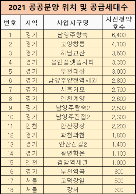 * 2021년 서울, 경기도, 공공분양 아파트 분양계획도 맨밑에 첨부하였습니다.