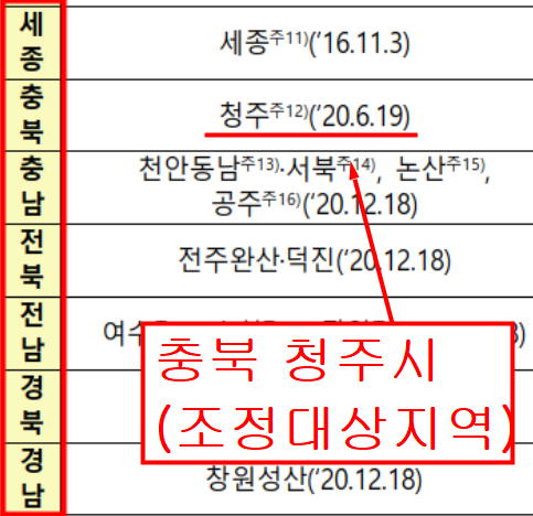또한 위에 보시듯이 충북 청주시는 2020년 6월19일자로 조정대상지역이 되었습니다.