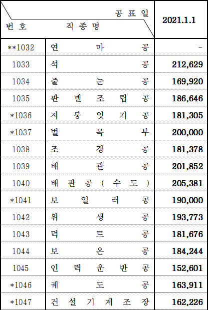 2021 상반기 노임단가중 낮은 보수의 기술자 및 노동자분들의 처우가 점점 나아지길 바랍니다.