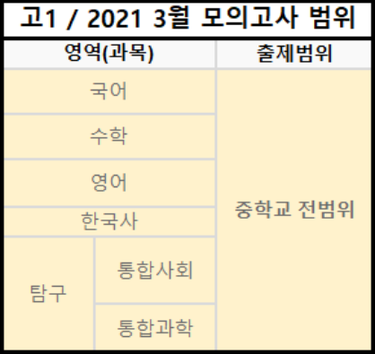 고1의 경우에는 중학교 전범위가 2021년 3월 모의고사 범위에 해당됩니다.
