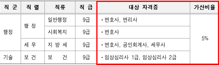 기술사와 기능장, 기사, 산업기사는 5%의 가산점이 있습니다.