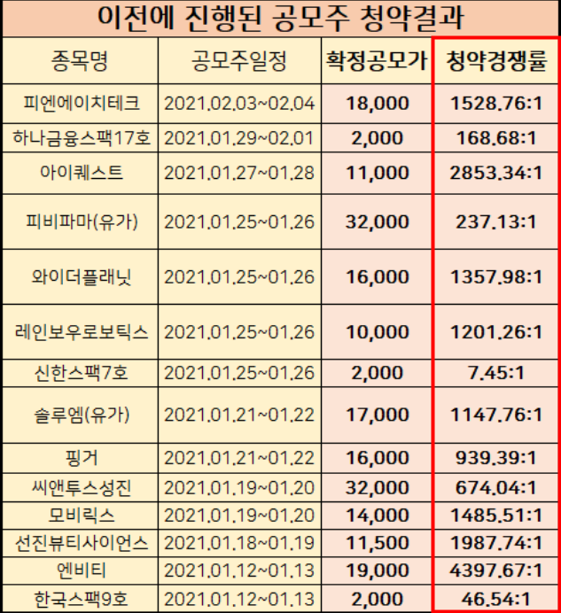가장 최근에 아이퀘스트 상장 공모주 경쟁률만해도 2,853:1로 엉청난 인기를 보였습니다. 코스닥, 코스피 지수가 높아지면서 공모주 상장 청약인기가 많아졌습니다. * 아래 최근 공모주 청약경쟁