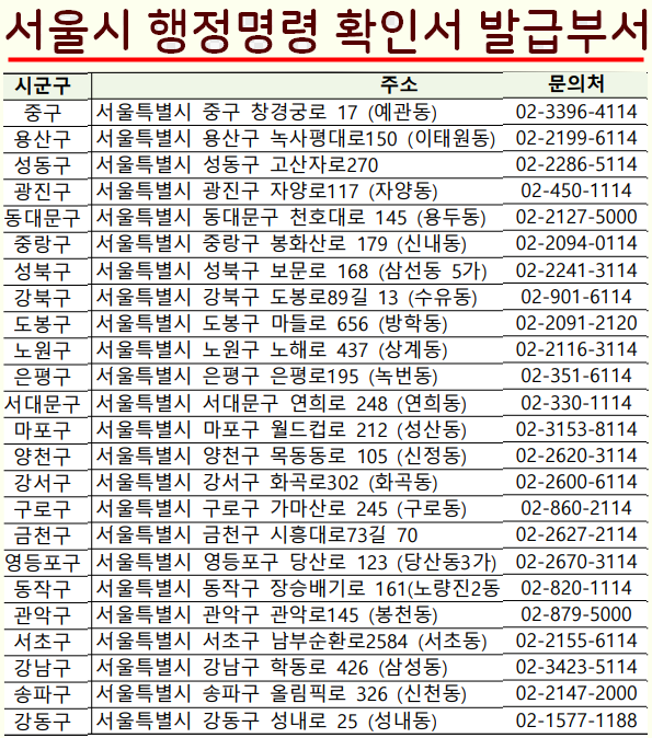 맨 위에서 서울의 경우만 송파구, 강남구, 마포구 등 지역별 방역조치 행정명령 이행확인서 발급처의 주소 및 전화번호를 알려드렸습니다.