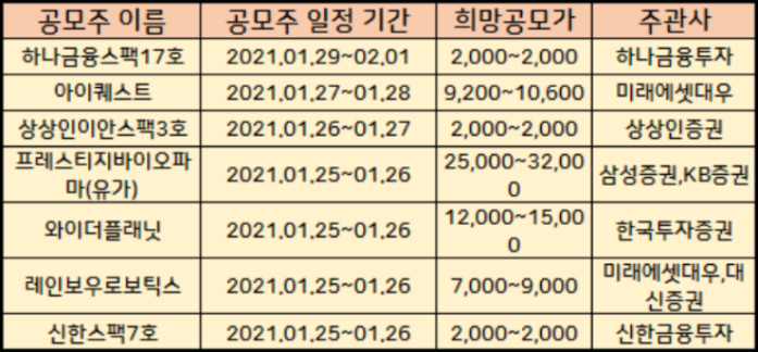 우선 2021년 2월에 상장예정인 공모주 청약일정표를 알려드리겠습니다.