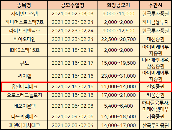 우선 유일에너테크 공모주 일정은 2021.2.15.~2.16.으로 예정되어있습니다.