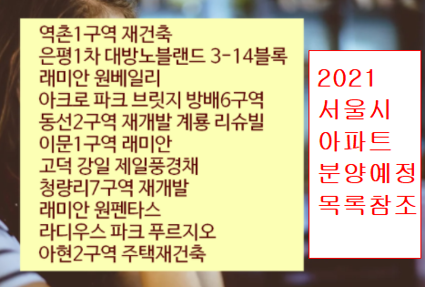 서울과 경기도 과천시, 광명시, 하남시 지역 대부분에 분양가 상한제가 시행되었습니다. 그리고 아파트 분양에서 엉청난 청약 열풍이 일어났습니다. 첫번째. 2021년 서울의 아파트 분양 계획 및