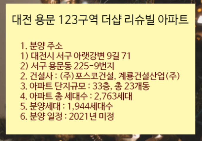 대전시 서구에 인기있는 용문123구역의 재건축 아파트는 인기있는 분양중에 하나입니다. 세대수가 2,763세대로 실로 어마어마한 대단지아파트이면서 포스코건설에서 짓는 더샵 리슈빌 아파트입