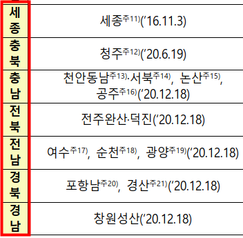 그리고 아래에는 세종, 충북, 충남, 전북, 전남, 경북, 경남지역의 조정대상지역을 정리한 표이니 한눈에 편하게 보실수있습니다.