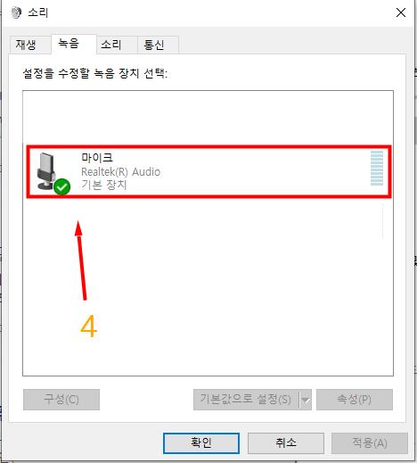다섯번째, 마이크를 더블클릭하면 '마이크 속성'창이 표시됩니다.