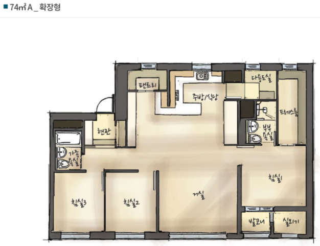 74A형의 평면도를 살펴보시면 보시는것처럼 주방과 거실이 넓어서 좋아보이며, 발코니도 있고 드레스룸과 화장실2개가 있습니다. 딱 적당한 규모의 아파트 평면도인것같습니다.