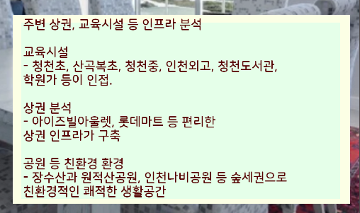 1. 청천초, 산곡복초, 청천중, 인천외고, 청천도서관, 학원가 등이 인접해 있어서 좋은 교육환경 인프라를 접할수있습니다.