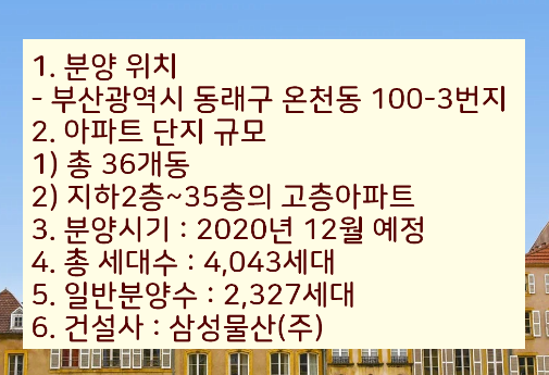 다시한번 온천장 래미안 포레스티지 아파트 분양에 대해서 요약해보겠습니다.