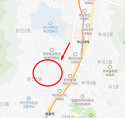 가까운곳에 온천장역이 있으며 보시는것처럼 위로는 부산대역과 아래로는 명륜역이 위치해서 지하철 이용이 수월합니다.