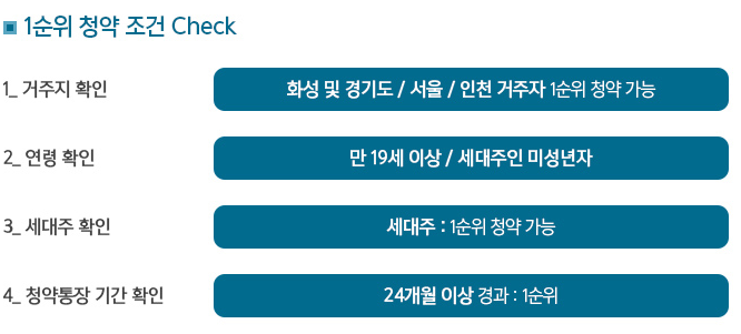 우선 거지주가 화성시 및 경기도에 위치하고 서울, 인천 거주자에게 1순위청약이 가능합니다. 그리고 연령은 기본적으로 만19세 이상, 세대주인 미성년자입니다. 청약통장은 24개월 이상 갖고있어야하며, 일정 금액의 예치금만 통장에 갖고 있으면 됩니다.