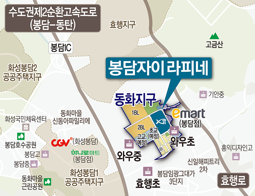 봉담자이 라피네의 분양 위치는 아래 지도에서 보시는것처럼 봉담 emart 부근에 있으며, 근처에 초교와 고교가 예정되어있다고 합니다.