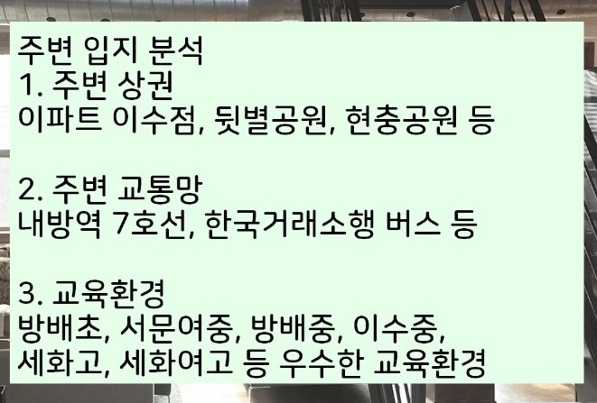 2. 교육환경도 뺴놓을수가 없는데요. 서울시 서초구의 위치하여 주변에는 방배초등학교와 서문여중학교, 세화여고 등의 다양한 우수한 교육환경 인프라를 갖추고 있다고 생각합니다.
