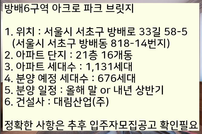 다시한번 방배6구역 아크로 파크 브릿지 분양가 예상 및 일반분양 일정 및 공급 세대수 등을 정리해보겠습니다.