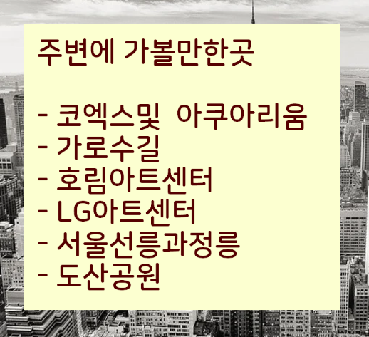 2. 대중교통시설 : 청담역 7호선과 봉은사역 9호선이 가까우며, 인천공항행 버스를 이용하기 용이합니다.