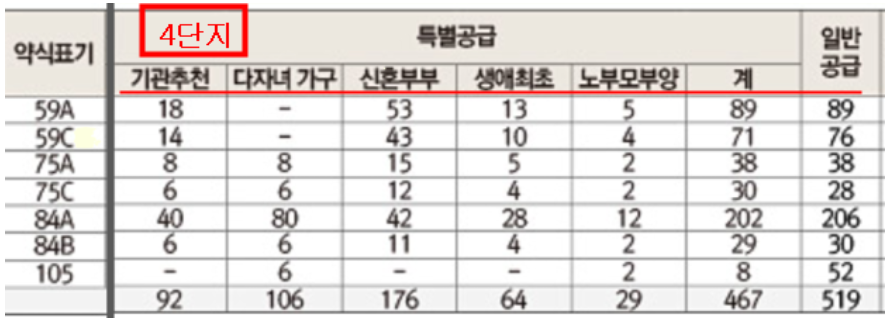 4단지 분양가, 특별공급 및 일반공급 세대수