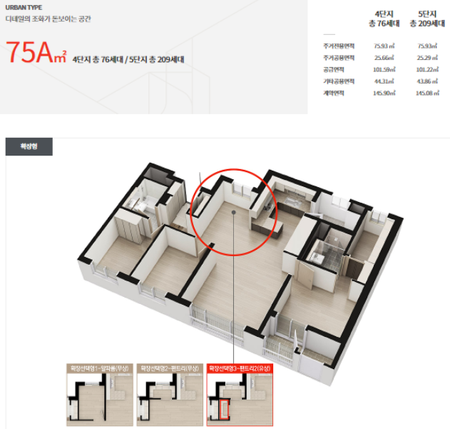 75A형 확장형 아파트 평면도에서는 4단지는 76세대수를 지원하고, 5단지는 2099세대를 공급합니다. 주방과 거실공간이 넓어서 휴식공간이 넓어서 좋아보입니다.