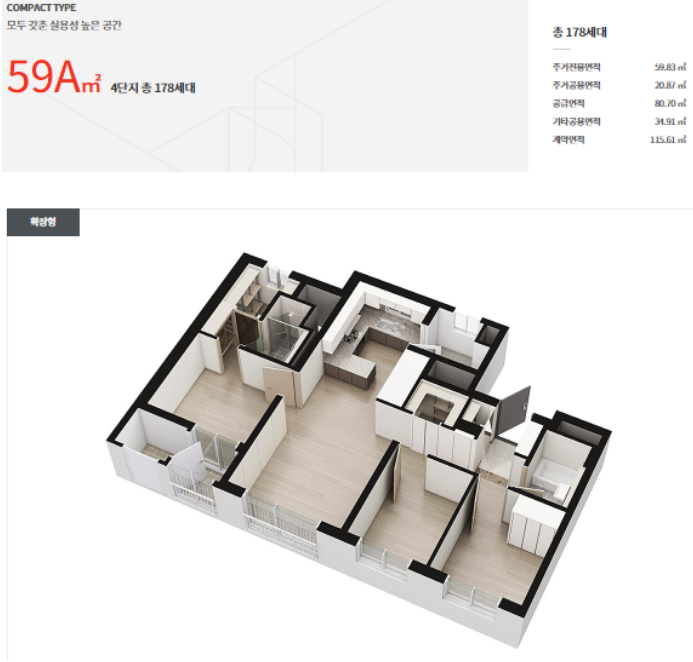 3. 아파트 평수 : 59(제곱미터)~105(제곱미터) 타입