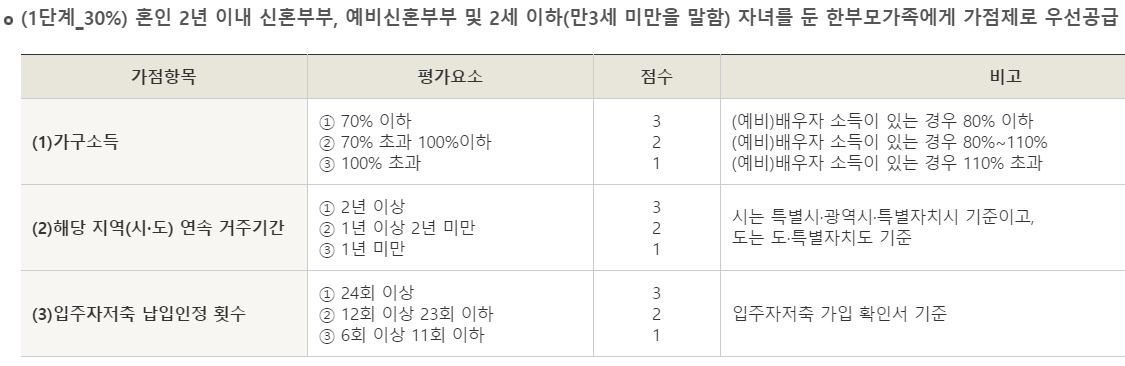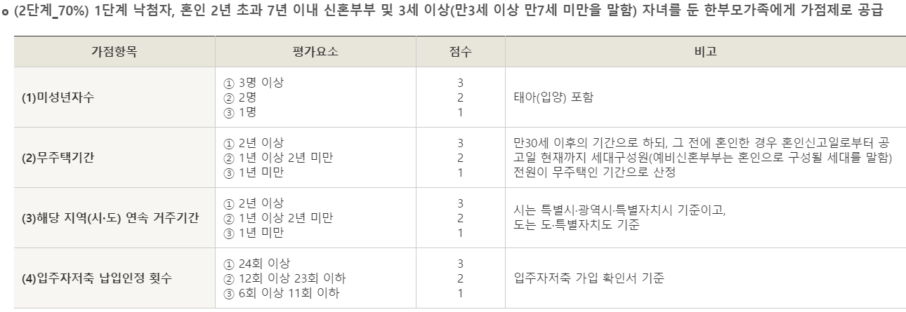 그리고 2단계에서는 1단계 낙찰자중에서 혼인 2년초과부터 7년이내 신혼부부 및 3세 이상 자녀를 둔 한부모가족에게 위에서 보듯이 가점제로 분양 공급을 지원합니다.