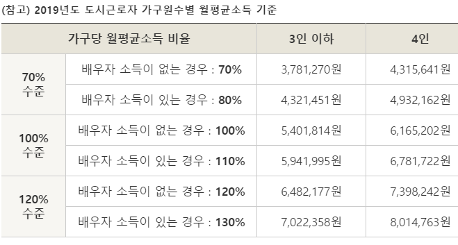 위에서 말씀드린대로 위례 A2-6 신혼희망타운도 소득 자격 요건을 충족해야할것으로 보입니다. 전년도 도시근로자 월평균 소득표에서 보시듯이 120%이하의 소득이 발생하여야하며 배우가도 근로 및 사업 등 소득이 있으면 130%까지 완화애서 적용됩니다. 이렇게 소득뿐만 조건이 있는것이 아닙니다.