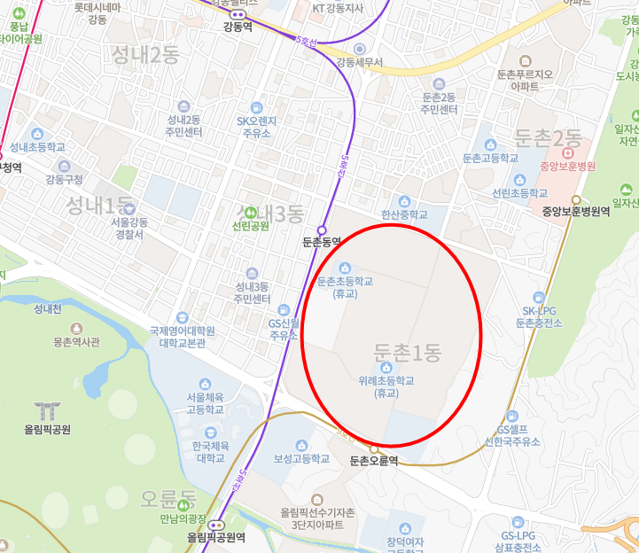 우선 둔촌 주공아파트는 지도에서 보시다싶이 근처에 올림픽공원이 있으며 주변에 교육환경 인프라가 잘 갖춰져있습니다.