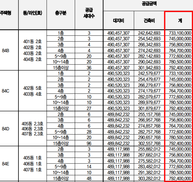 보시다시피 과천 푸르지오 어울림 라비엔오 84형의 분양가는 1층은 7억3,310만원이며 반대로 로열층이라고 불리는 15층 이상은 7억9,240만원으로 다소 차이가 있습니다. 저층 분양을 희망하시는분들은 보통 계단을 이용하시거나 아파트출입시간을 아끼려는분들이 많이 선호하십니다. 또한 각 동별로 같은 층이라도 아파트 분양가가 다소 다릅니다.