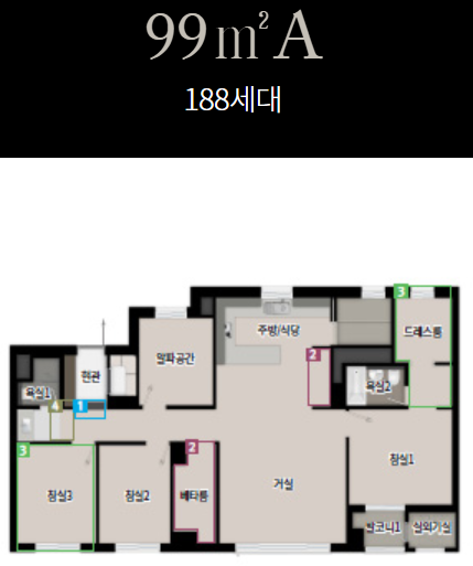 2. 특별공급이 아닌 일반분양으로 신청하실분들은 좀 넓은평수를 원하신다면 99형의 평면도를 아래에서 확인해보시고 청약 지원하시기를 추천드립니다.