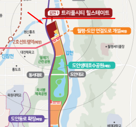 그렇다면 갑천 1블럭의 트리플시티 힐스테이트 공공분양 아파트의 지리적 이점은 어떻게 될까요?.