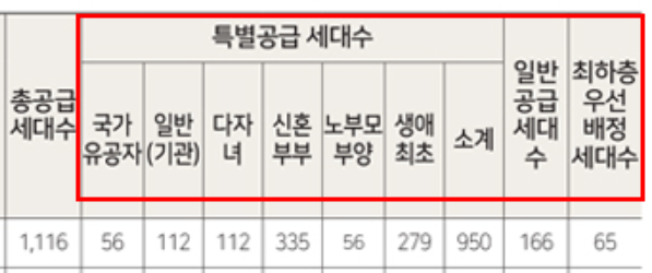 그리고 마지막으로 국가유공자 및 노부모부양특별공급은 각각 56세대수의 공공분양 아파트 주택을 공급합니다.