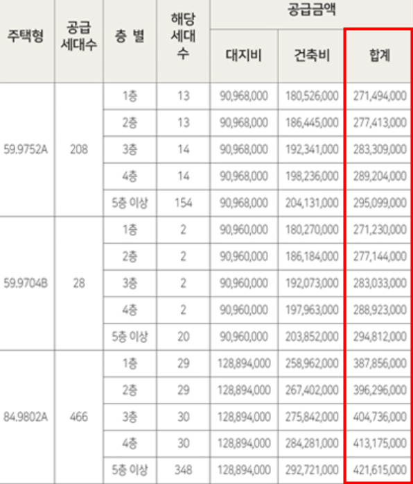 2. 84A형의 경우에는 3억 후반에서 4억 초반의 공급금액을 형성하고 있습니다.