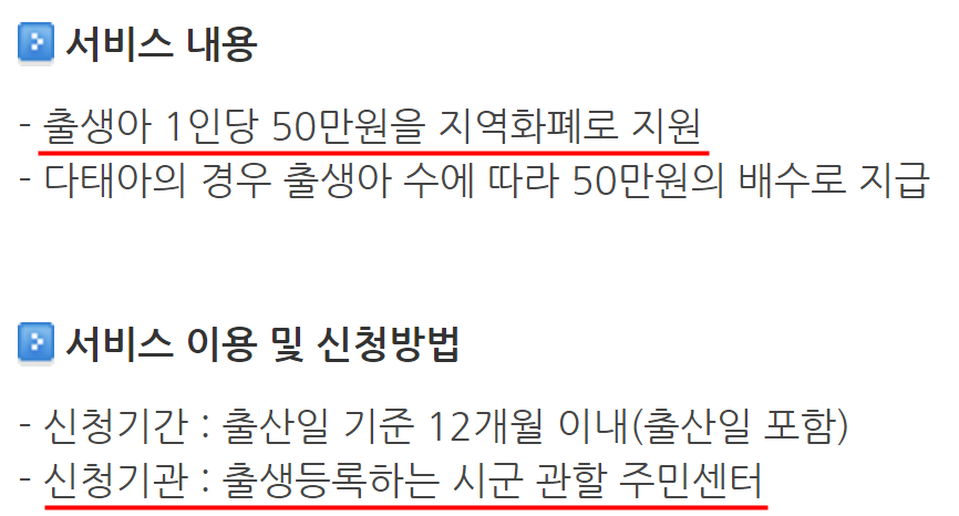 3. 지원금액 : 출생아 1인당 50만원 지원(다태아의 경우 50만원 배수로 지급)합니다.