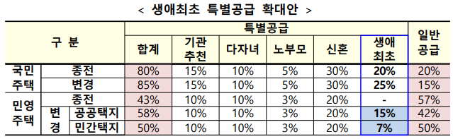 이전까지는 국민주택에만 생애최초 특별공급이 일반적으로 적용되었지만 아래에서 확인하실수있는데 2020년 9월중에 민영주택에도 생애최초 특별공급이 적용됩니다. 그렇기 떄문에 85제곱미터 이하의 공공택지 분양물량중에서 15%를 배정하고 민간택지에는 7%를 공급배정합니다.