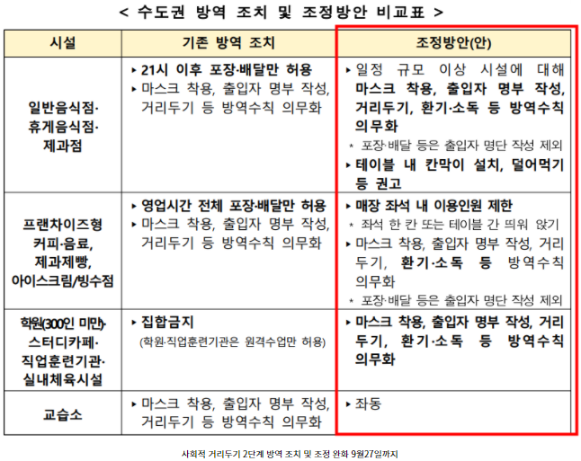 사회적 거리두기 코로나 2.5단계에서 완화된 2단계 조치가 9월27일까지 시행됩니다. 우선 2단계 완화 단계에서는 아래표에서 보시는것처럼 수도권 대상으로 적용되며 일반,휴게 음식점이 9시 이후에도 영업이 가능하고 프렌차이즈형 커피점과 제과제빵, 아이스크림 가게 등이 배달포장만 가능했던것에서 매장내 이용이 가능해집니다.