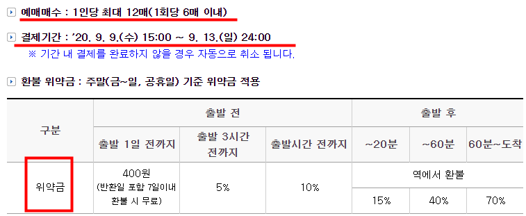 코레일 추석 기차표 예매시 1인당 최대 12매를 예매하실 수 있으며 1회당 6매 이내인점을 참고하시기 바랍닏. 결제기간은 2020.9.9.(수)~9.13.(일) 24:00이니 참조하시기 바랍니다.