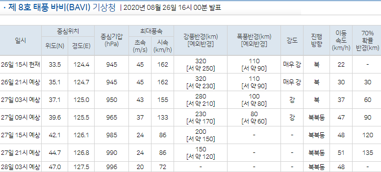 제 8호 태풍 바비(BAVI) 기상청 | 2020년 08월 26일 10시 00분 발표 태풍 3일예보 일시 중심위치 중심기압(hPa) 최대풍속 강풍반경(km)[예외반경] 폭풍반경(km)[예외반경] 강도 진행방향 이동속도(km/h) 70%확